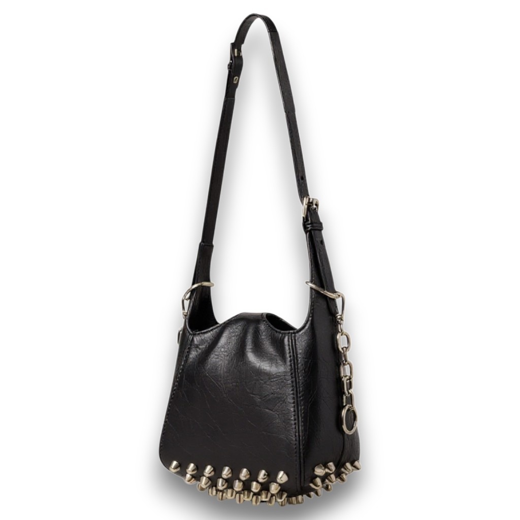 Made for nights that run late and bars that run loud, our Vi-Vain handbag is crafted in a high-shine distressed faux leather with luxurious leatherette lining. Small in stature, but serious in statement, this upcycled gem features a unique bucket shape, maximalist spiked base, and the mother of all detachable chain details.